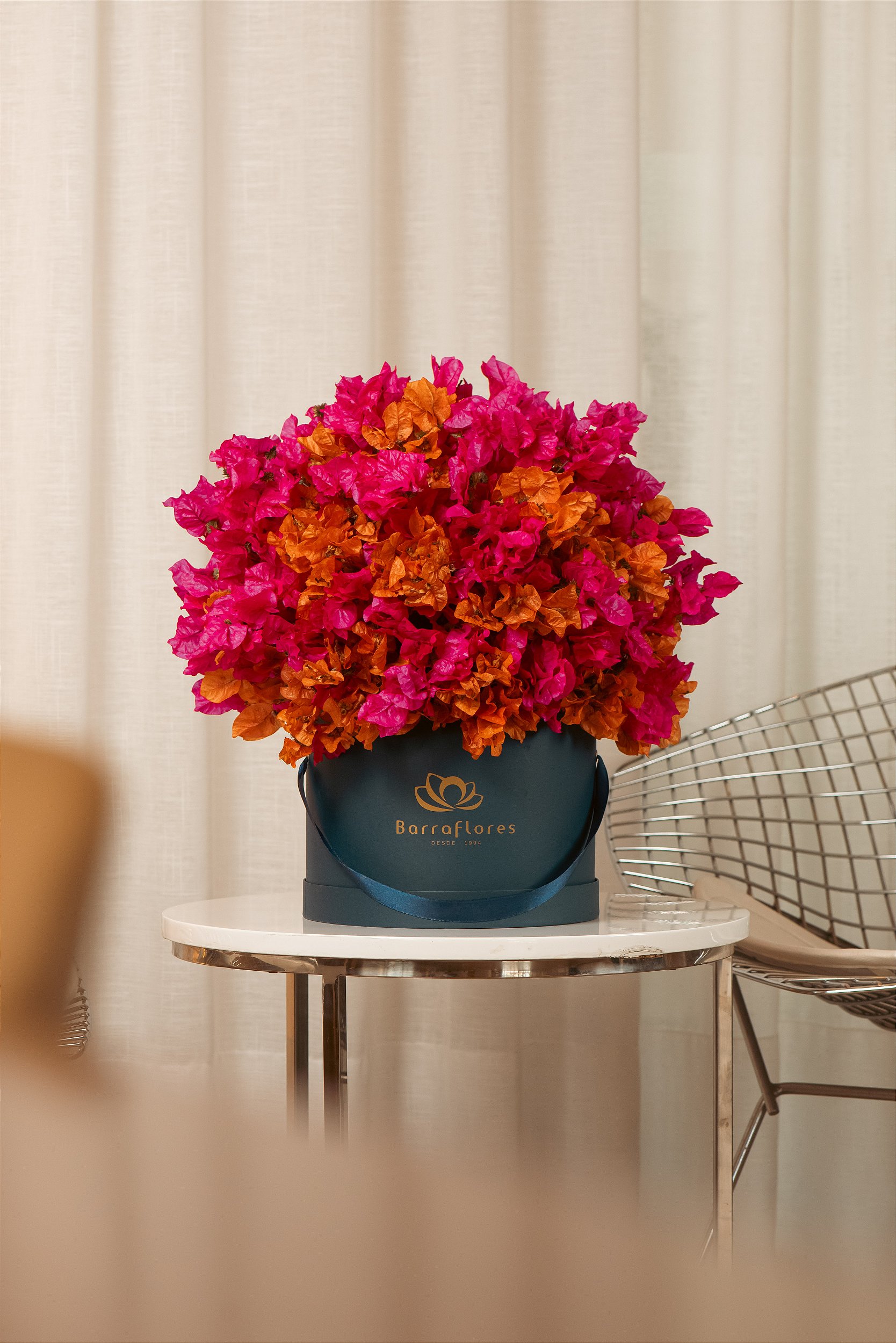 Em nossa elegante box redonda da Barra Flores, um arranjo deslumbrante de Bouganvilles desidratadas nas tonalidades pink e laranja é cuidadosamente montado em formato arredondado, equilibrando intensidade e delicadeza. Um espetáculo visual que transmite calor, elegância e personalidade.