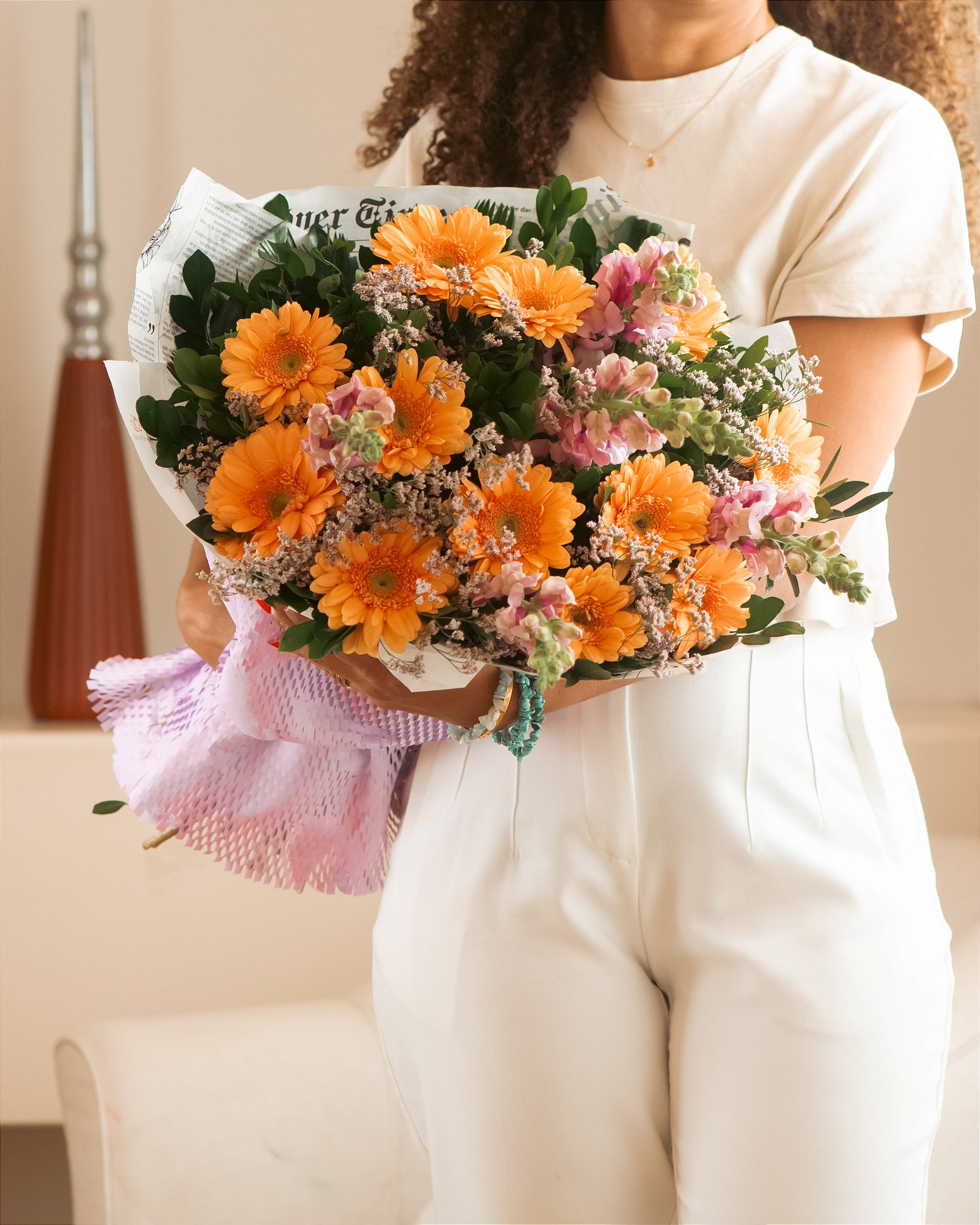 Um buquê que celebra a leveza e a elegância da primavera em cores suaves. As 12 gérberas pêssego, abertas como pequenos sóis delicados, irradiam luminosidade e alegria. Ao lado delas, as 5 bocas-de-leão lilás se erguem imponentes, trazendo movimento e imponência ao arranjo.