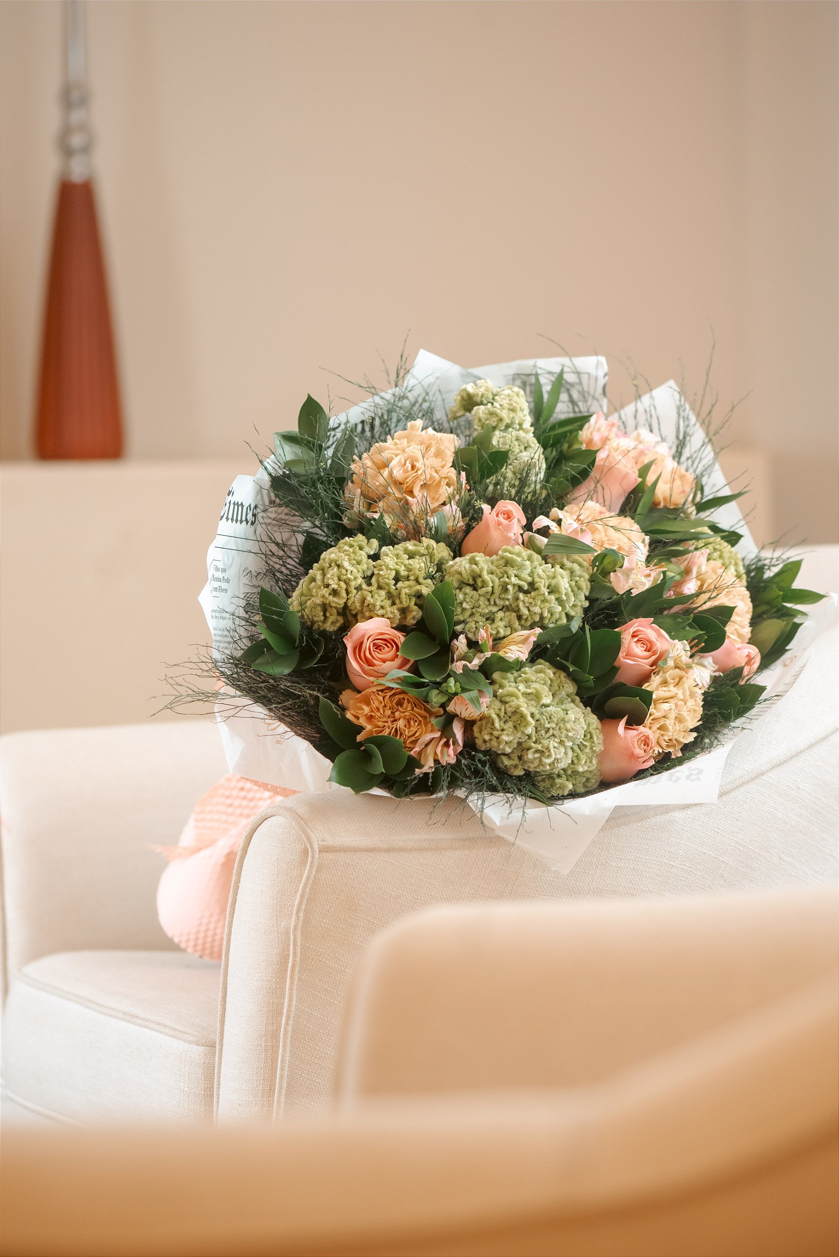 As 6 rosas em tom rosa trazem delicadeza e romantismo, enquanto os 6 cravos rosa vintage evocam elegância atemporal. Para completar, as 5 celosias verdes introduzem um toque exótico e contemporâneo, criando contraste sofisticado.