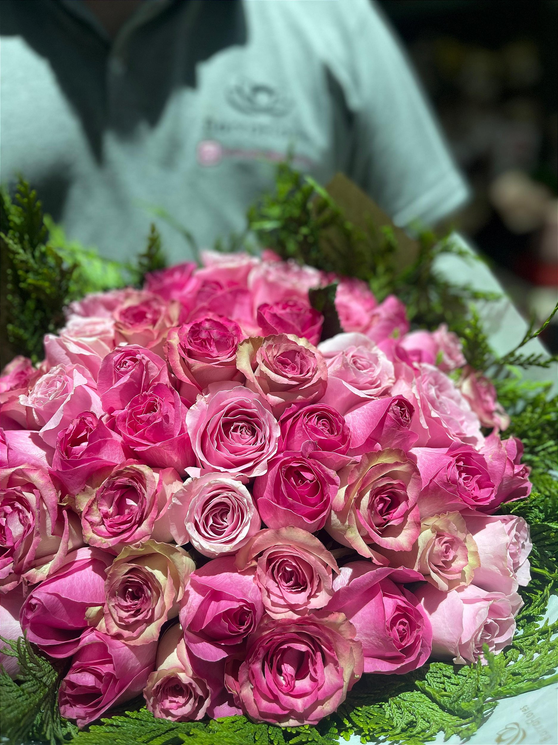 Buquê Ibiza – Um toque de delicadeza e sofisticação com 50 Rosas em Tons de Rosa