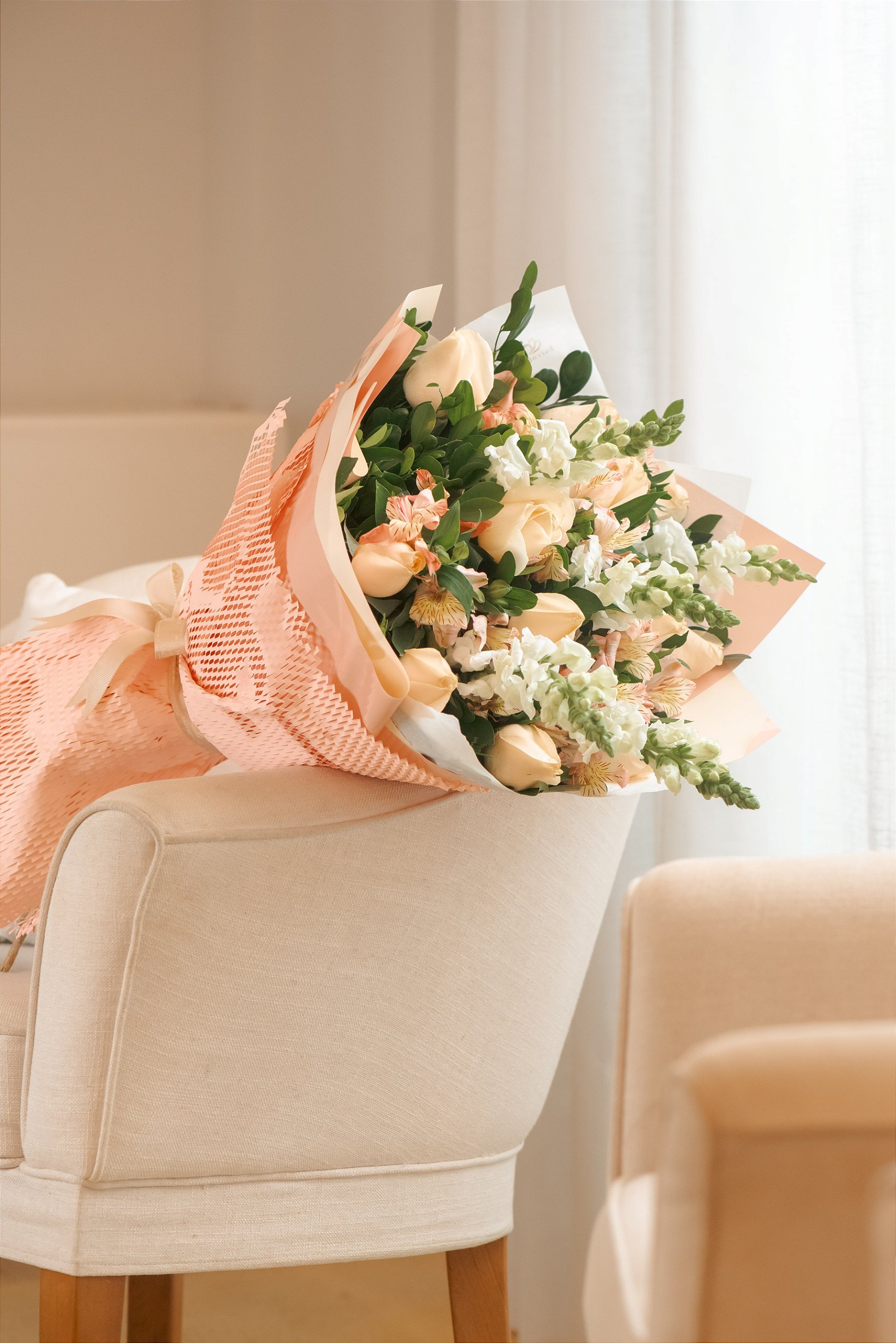 Delicadeza e sofisticação em um só gesto. O Buquê Peach Bloom combina a elegância das 12 rosas chá, que irradiam suavidade e classe, com a leveza das alstroemérias rosa claro, criando uma paleta romântica e atemporal.