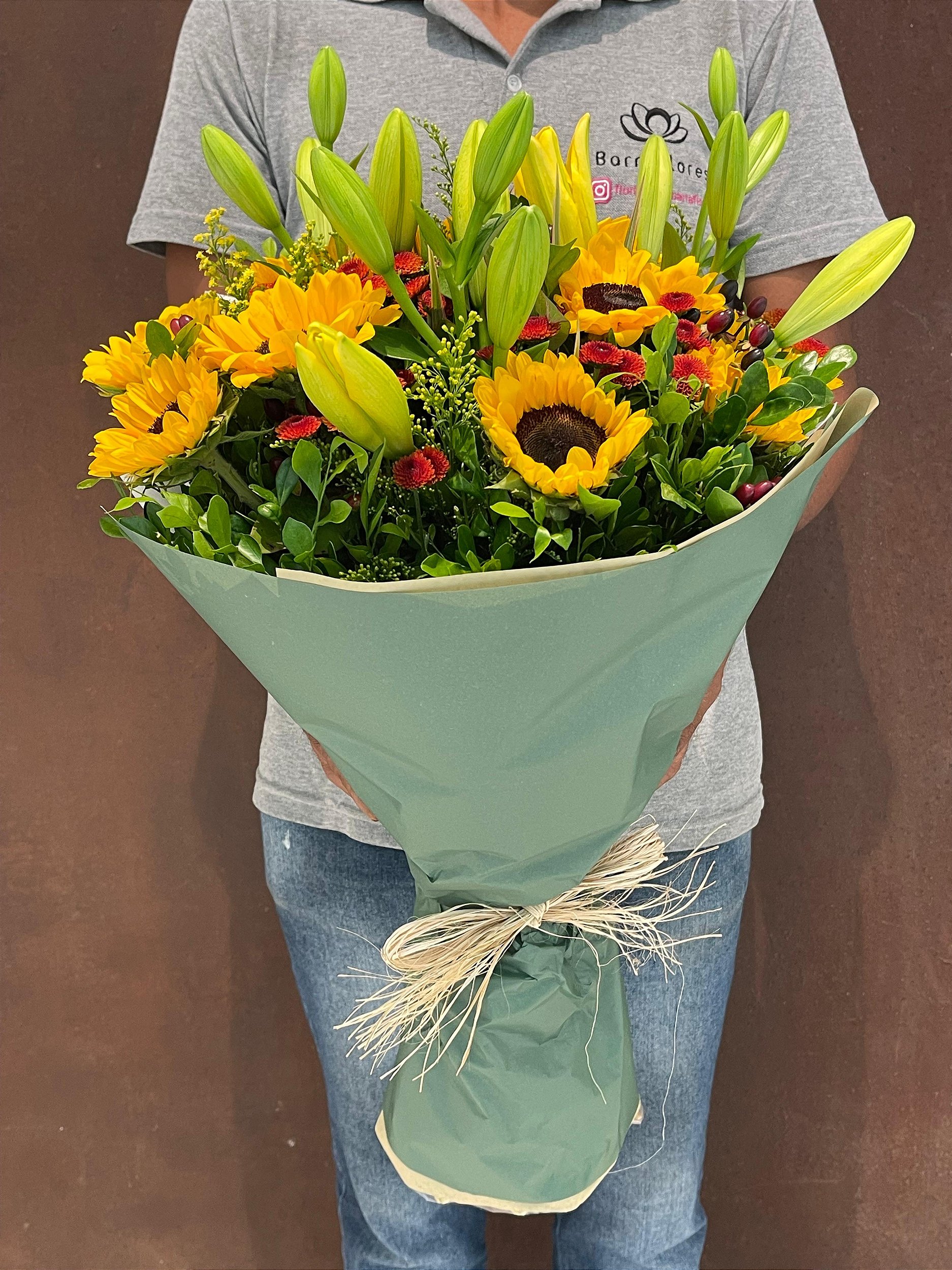 Inspirado na intensidade e na beleza do entardecer, o Buquê Pôr do Sol é a perfeita tradução de elegância e energia. Com 12 girassóis exuberantes, lírios amarelos (ou laranjas, conforme disponibilidade), crisantemo santini e hypericum, essa composição vibrante transmite calor, alegria e sofisticação.