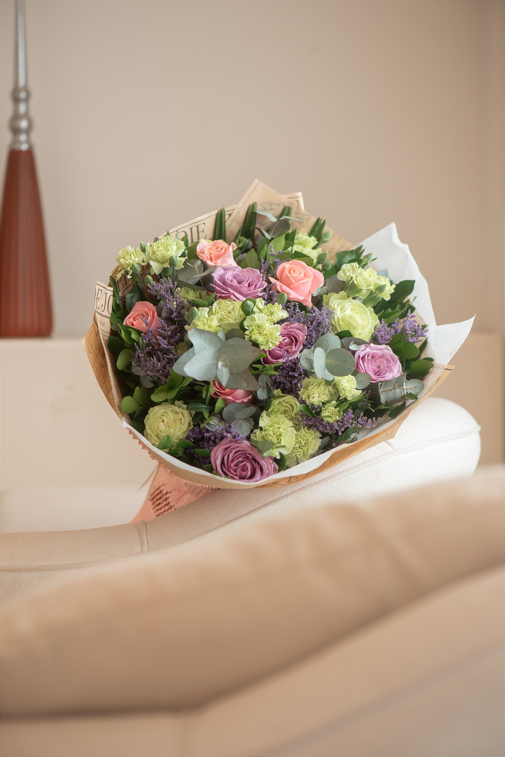 Uma composição que traduz o frescor da primavera em cores suaves e envolventes. Este buquê reúne a delicadeza de 4 rosas lilás, o romantismo das 4 rosas Hermosa e a ousadia contemporânea das 4 rosas Wasabi.