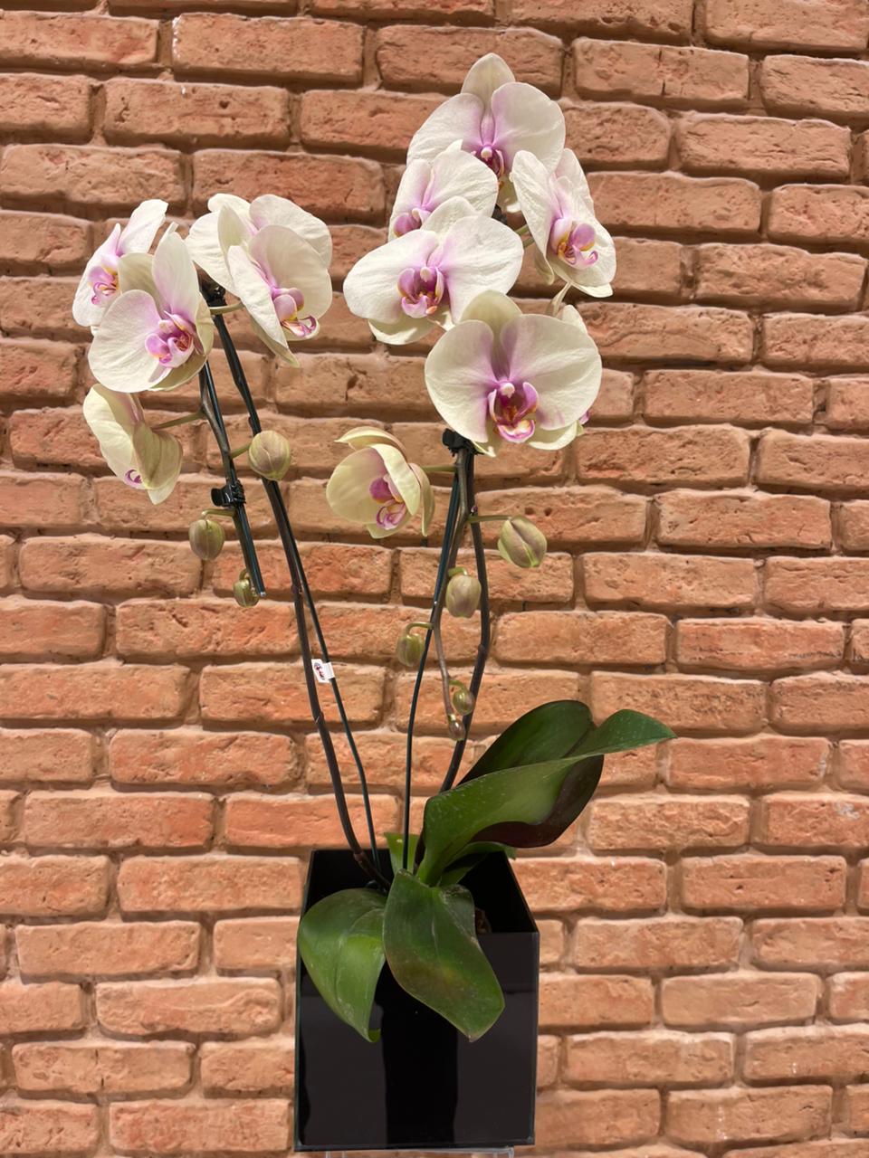 Apresentada em um cachepô de vidro quadrado preto, de linhas retas e contemporâneas, a composição ganha ainda mais requinte com o acabamento em musgo natural ou barba-de-velho.
