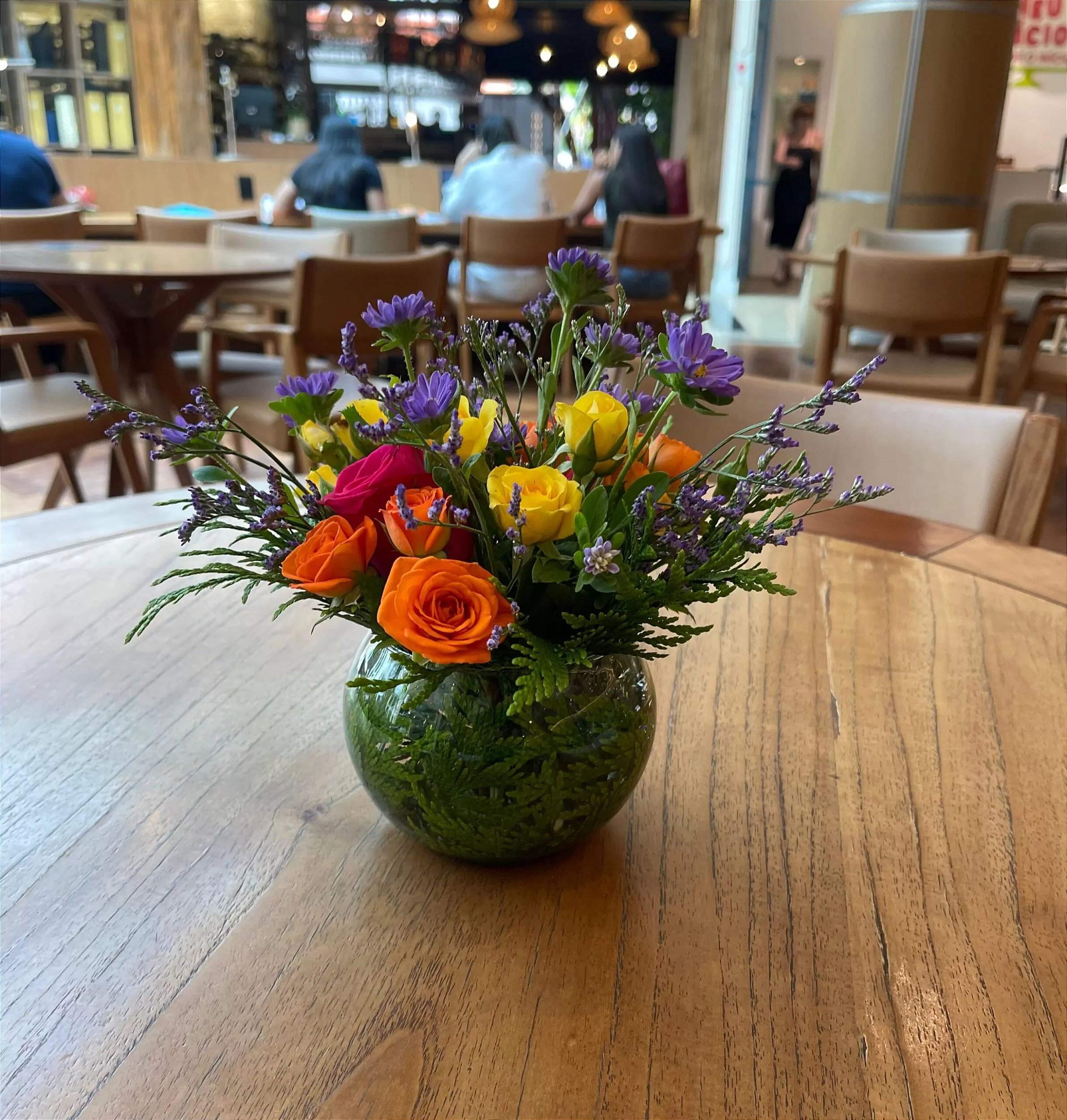 Montado em um sofisticado vidro redondo de alta qualidade, o arranjo apresenta uma curadoria de flores frescas em tons vibrantes de laranja, amarelo e roxo, equilibradas com folhagens verdes naturais que realçam sua beleza e criam uma composição harmônica e contemporânea.